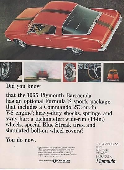 Amazon Com Magazine Print Ad Red 1965 Plymouth Barracuda Formula S Sports Package Did You Know Commando 273 Cu In V 8 You Do Now Entertainment Collectibles