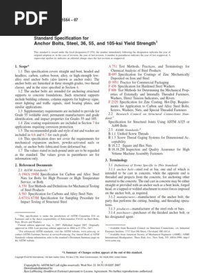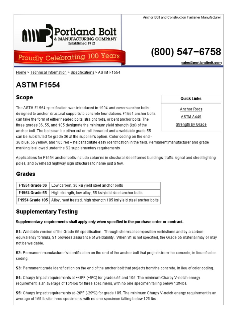 Astm f1554 is the specification for anchor bolts or anchor rods that designates three grades 36 55 and 105 each with different chemical properties and yield strengths. The f1554 specification is used in construction related projects such as commercial developments structural supports and residential developments. The astm f1554 specification was introduced in 1994 and covers anchor bolts designed to anchor structural supports to concrete foundations.