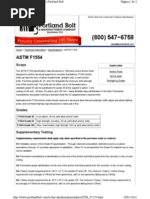 The specification for astm f1554 covers straight and bent headed and headless carbon carbon boron alloy or high strength low alloy steel anchor bolts also known as anchor rods. Values in this chart are advisory only all applications vary. F1554 is the astm international specification for anchor bolts until the astm f1554 specification was introduced anchor bolts did not have a specification of their own.