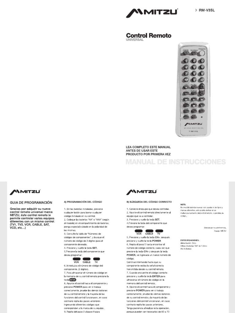 Lista de codigos para control mitzu mrc 1020. De no funcionar correctamente el control puedes repetir el punto 2 o intentar otra forma de programacion. Una vez que tienes el codigo identificado una vez que ya el televisor cambio de canal debes presionar y soltar el boton mute para que el control recuerde el codigo y puedes utilizarlo de manera regular.