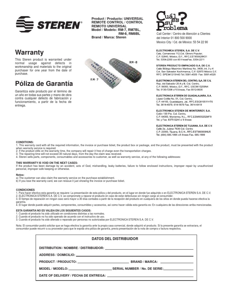 Codigos de control universal steren marca rm 8 existen 2 tipos de programacionrapida y automaticacomo utilizar la programacion rapida antes de comenzar a utilizar su control remoto asegurese de que tengainstaladas 2 baterias alcalinas nuevas o con carga suficiente tipo aa rm 7 o 3 baterias alcalinas nuevas o con carga suficiente tipo aaa rm 8usted puede utilizar la programacion. Importante no intente abrir el equipo. El control universal es muy versatil por su facilidad en la programacion y te permite configurarlo con diferentes aparatos que soportan el uso de un control remoto por lo que te explicaremos los codigos de control universal rca para tv.