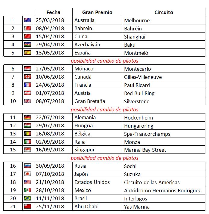 F1 2018 calendario. The 2018 f1 calendar was first revealed on june 19th 2017 and featured 21 races. Red bull were competitive but as their charge fell away it was all hamilton with the briton winning four f1 races on the bounce from monza to wrap up a fifth title as mercedes did the double once more. Following the 20 round 2017 championship the 2018 f1 calendar was scheduled to include one more race.