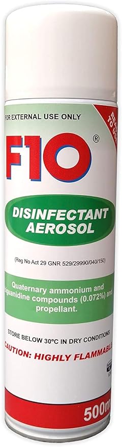 All f10 products making claims for the control of animal diseases have been registered with full marketing approval under stock remedied act 361947. F10 disinfectant surface spray with insecticide qac and biguanide 0116 cypermethrin 025. F10 sc aerosol fogger 500ml.