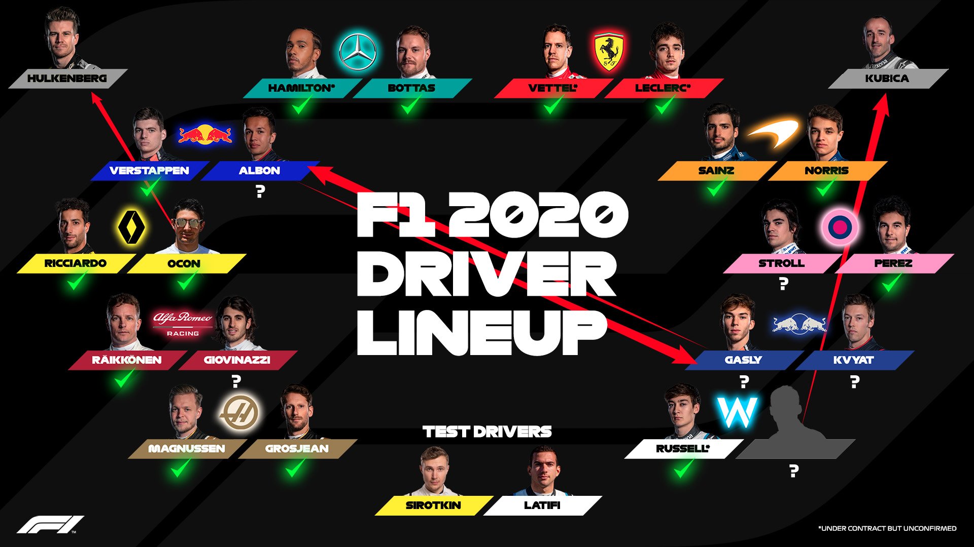 Formula 1 2020 drivers line up. Stability is the name of the game for the 2020 season with eight of the 10 formula 1 teams fielding unaltered line ups in their bid for grand prix glory. While mercedes renault and racing point might have settled their driver conundrums over the belgian grand prix weekend there is still a great deal of speculation over the rest of the grid. 2020s record breaking 22 race calendar including the return of the dutch grand prix and the brand new vietnam grand prix.