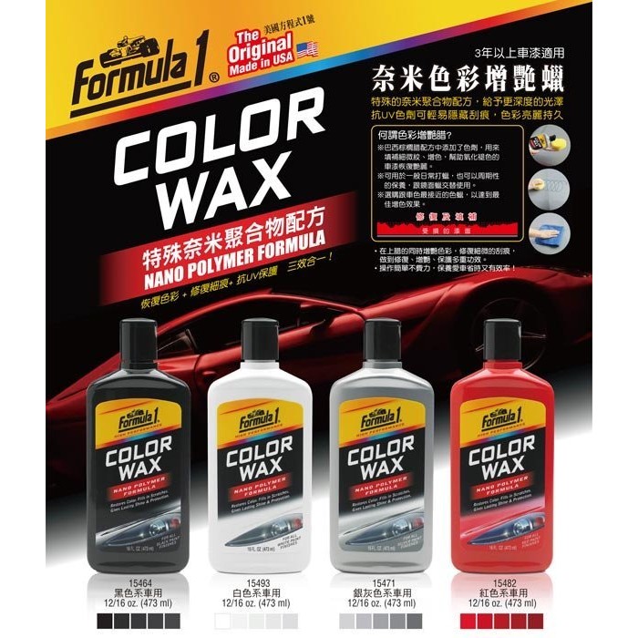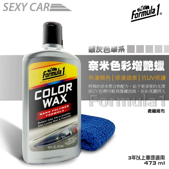Formula 1 color wax. Formula 1s exclusive nano polymer formula bonds to the paint finish giving long lasting protection. Advanced crosslinked polymer technology. Formula 1 silver color wax restores color and fills in scratches16 fl.