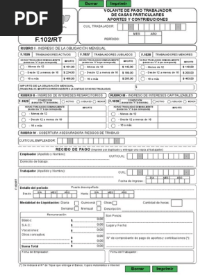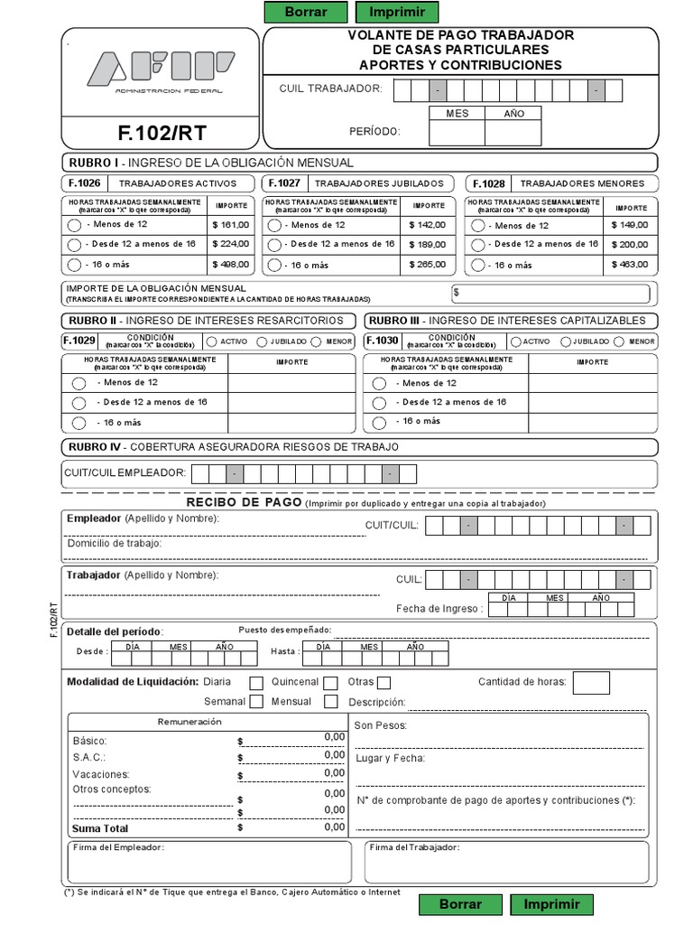 Formulario 102 rt 2019 para imprimir. Descargar formulario 102rt desde afip. Apenas este disponible en la web de afip el nuevo formulario lo vamos a estar agregando a esta pagina. 102rt hoja 1 de 2 mes ano periodo recibo de pago imprimir por duplicado y entregar una copia al trabajador rubro iv cobertura aseguradora riesgos de trabajo rubro i ingreso de la obligacion mensual rubro i ingreso de la obligacion mensual.