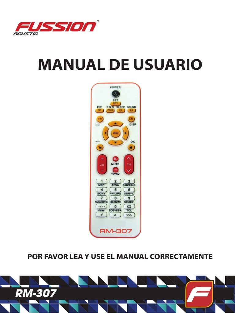 Lista de codigos para control universal fussion acustic. Haz clic aqui para cancelar la respuesta. Me podrian hacer el favor de pasarme los codigos de un control remoto universal marca fussion acustic modelo rm 305 para programarlo a un dvd lg por favor. No tiene productos agregados a su carrito de compras.