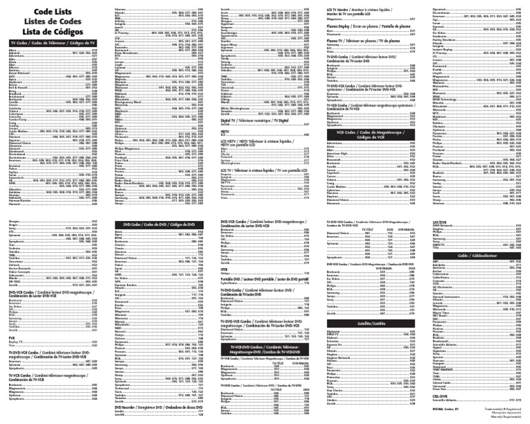 000 006 011 019 027 034 038 y 044. La forma mas rapida de programar un control remoto es usando el codigo pero si no tienes acceso a una lista de codigos puedes usar la funcion de busqueda de codigo en tu control remoto. Code lists brand codes are used for programming using the brand code search and entry method outlined in the users guide.