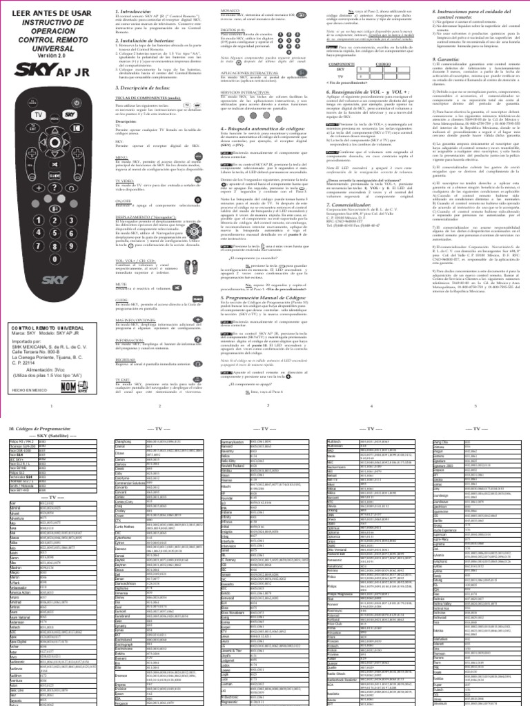 El control remoto esta disenado para controlar la caja digital de ultravision asi como varias marcas de televisores y dvdblue ray. Si el equipo a controlar no responde despues de tratar con todos los codigos de su marca o si la marca no esta en la lista trata de buscar el codigo para tu equipo de la siguiente manera. Control remoto universal marca.