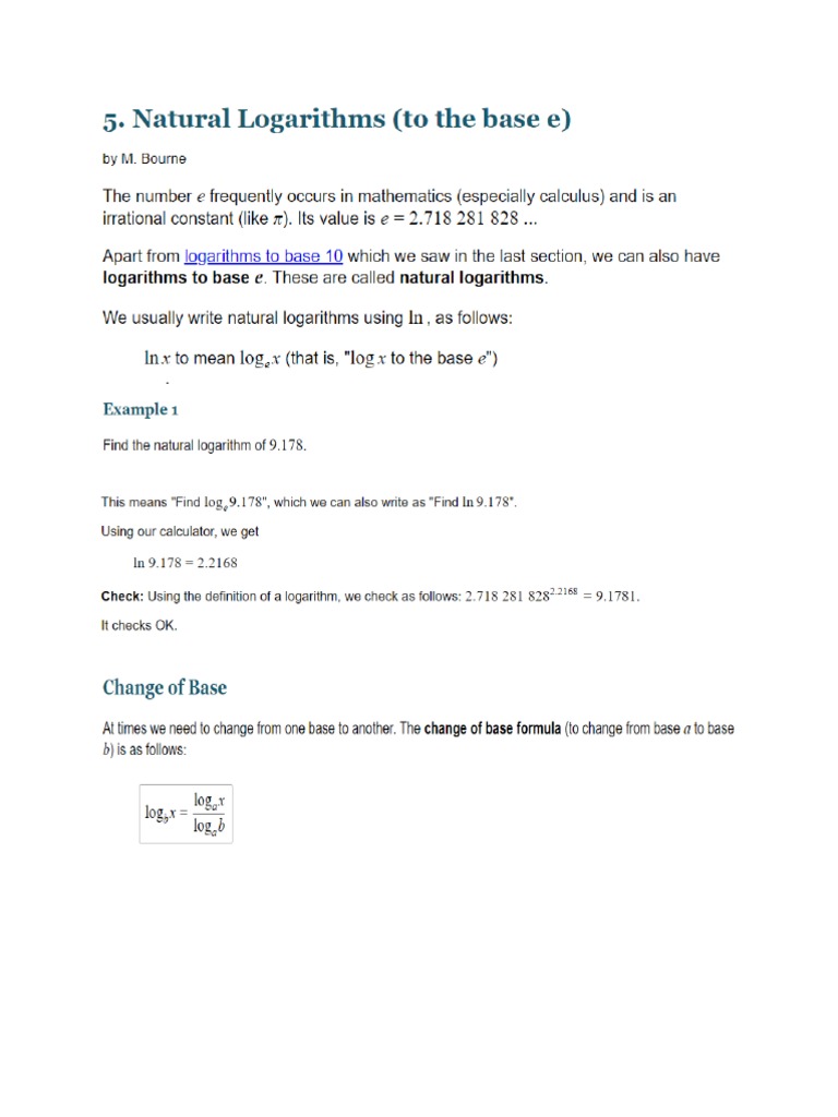 The natural logarithm of a number is its logarithm to the base of the mathematical constant e where e is an irrational and transcendental number approximately equal to 2718 281 828 459the natural logarithm of x is generally written as ln x log e x or sometimes if the base e is implicit simply log x. Lnx log e x when e constant is the number. Expressed mathematically x is the logarithm of n to the base b if b x n in which case one writes x log b nfor example 2 3 8.