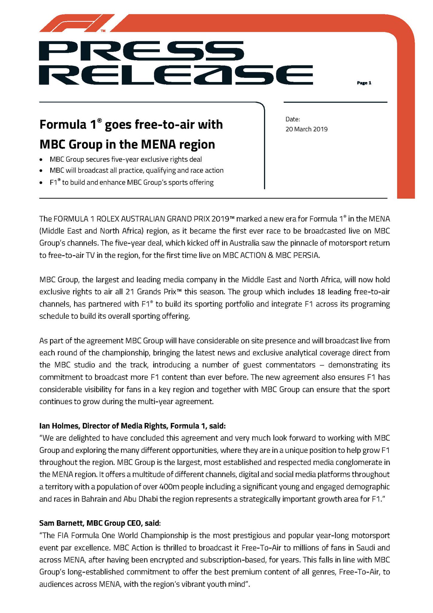 Find out where to watch the next f1 grand prix and never miss another race. Mbc action atmbcaction march 17 2019. The free to air television channel won five year exclusive rights to broadcast the tournament.