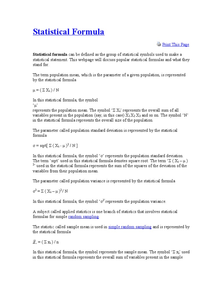 The term population mean which is the average score of the population on a given variable is represented by. . Each formula is linked to a web page that describe how to use the.