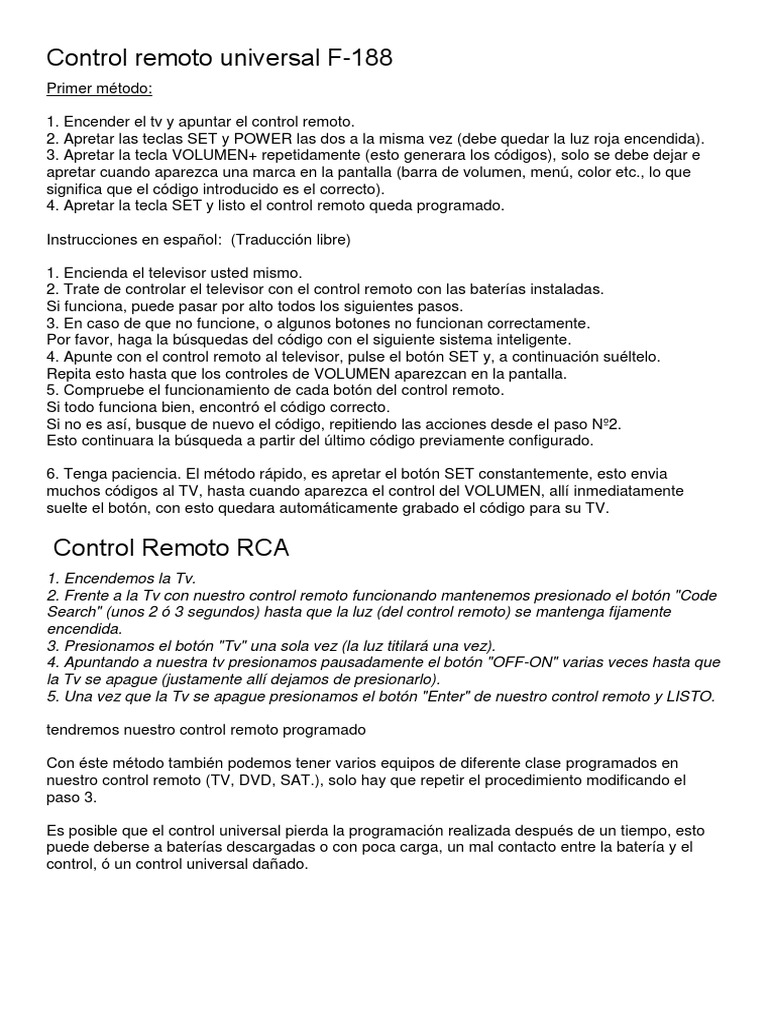 Control remoto universal f 188. Apretar la tecla volumen repetidamente esto generara los cdigos solo se debe dejar e apretar cuando aparezca una marca en la pantalla barra de volumen. Control remoto f 188 configurar mocosotec.