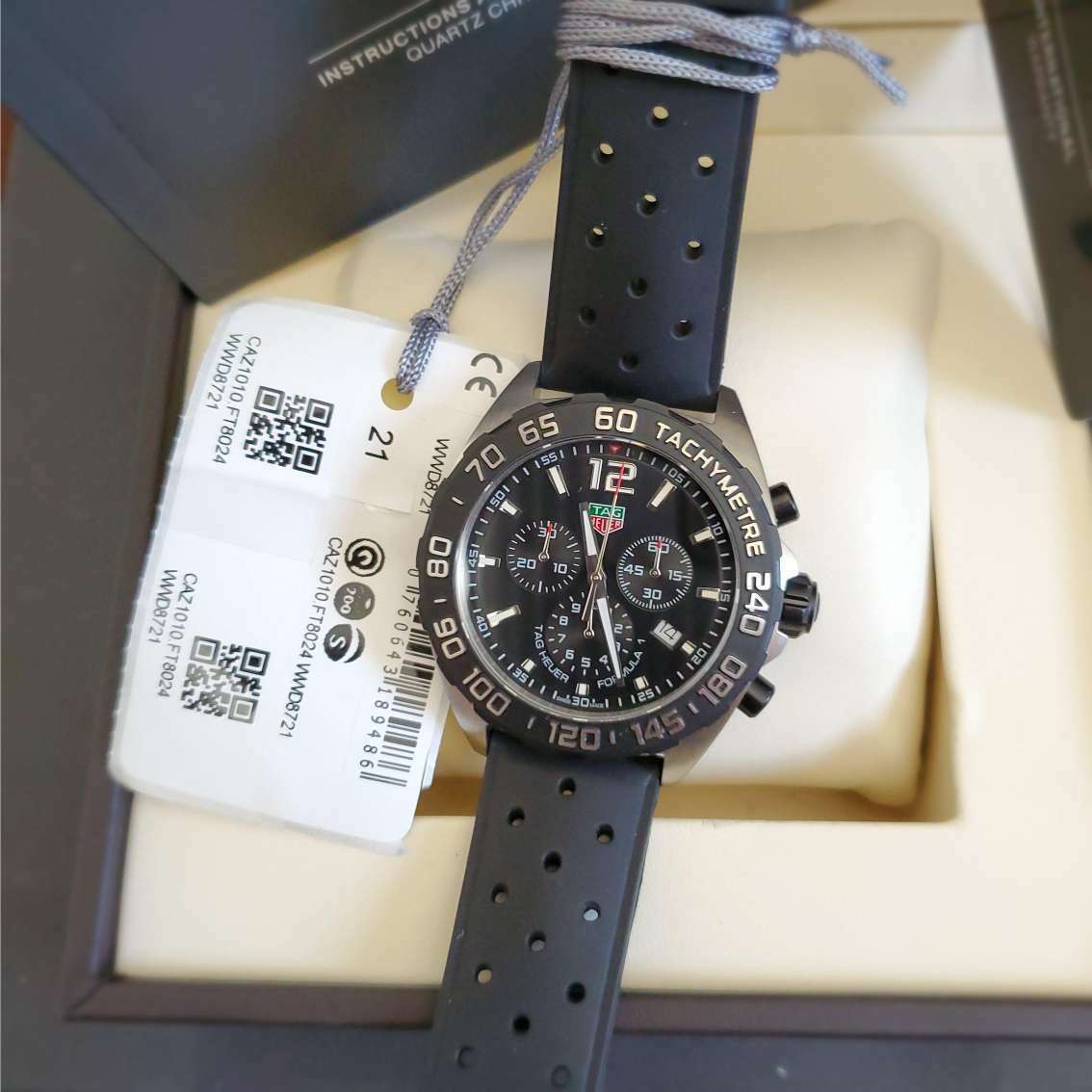 At a glance black perforated rubber strap 43mm stainless steel case with a black tachymeter bezel and 200m water resistance scratch resistant sapphire crystal black dial with arabic numeral and baton hour markers three chronograph sub. Buy tag heuer mens formula 1 swiss quartz stainless steel and rubber dress watch colorblack model. Tag heuer formula 1 watch caz1010 ft8024.