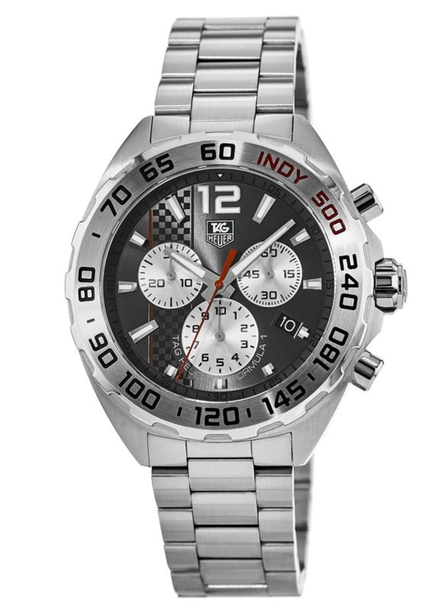 Designed exclusively for the indy 500 this watch has enough style and functionality to tear up the tarmac. Quartz chronograph diameter 43 mm as the official timekeeper of the indy 500 the tag heuer formula 1 limited edition timepiece pays tribute to this legendary race with 1500 numbered timepieces. This limited edition formula 1 quartz chronograph indy 500 mens watch from tag heuer combines a 42mm stainless steel case with a motor racing inspired anthracite dial topped with a scratch resistant sapphire crystal.
